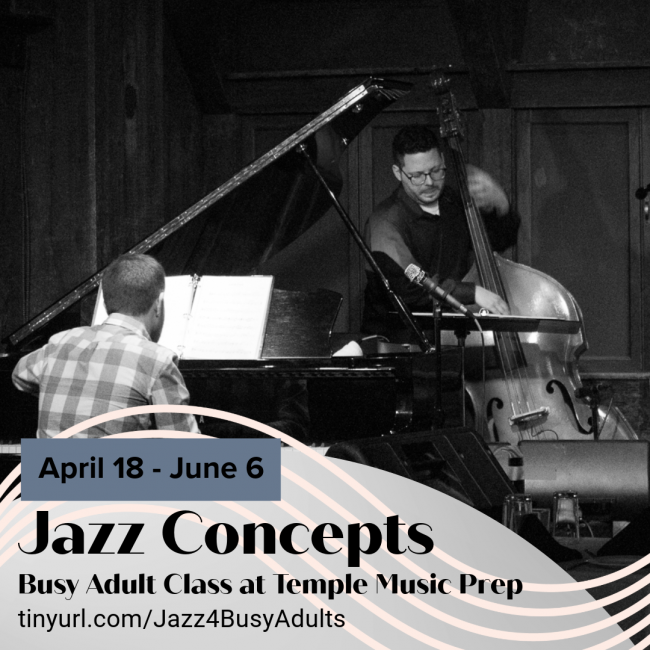 The Spring 2024 term of Jazz Concepts for Busy Adults Classes will be held April 18 through June 6, Thursdays at 6pm.