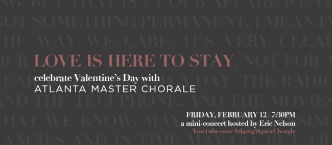 Celebrate Valentine’s with Atlanta Master Chorale on Friday, February 12 at 7:30 pm. Artistic Director Eric Nelson will host a live mini-concert, “Love is Here to Stay”, on our YouTube channel. The concert will include love songs previously performed by Atlanta Master Chorale as well as a few new performances featuring our AMC singers.